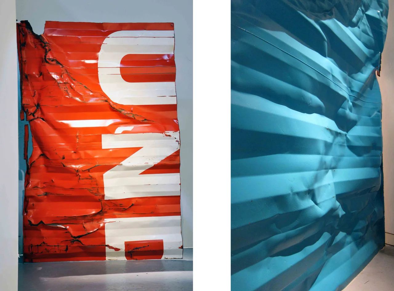 “Logistics from Sea to Land (For Giang and Nam)” Section of a salvaged steel, oil paint from Giang's studio. 2011. Dimensions: 7 feet x 4 feet.
