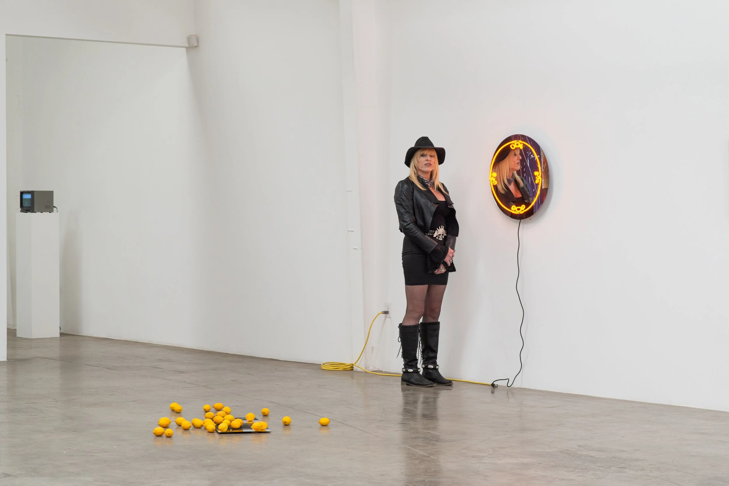 Title: Roxy Rose bends a Mirror & a Wheel of Joy in Gold, 2021.