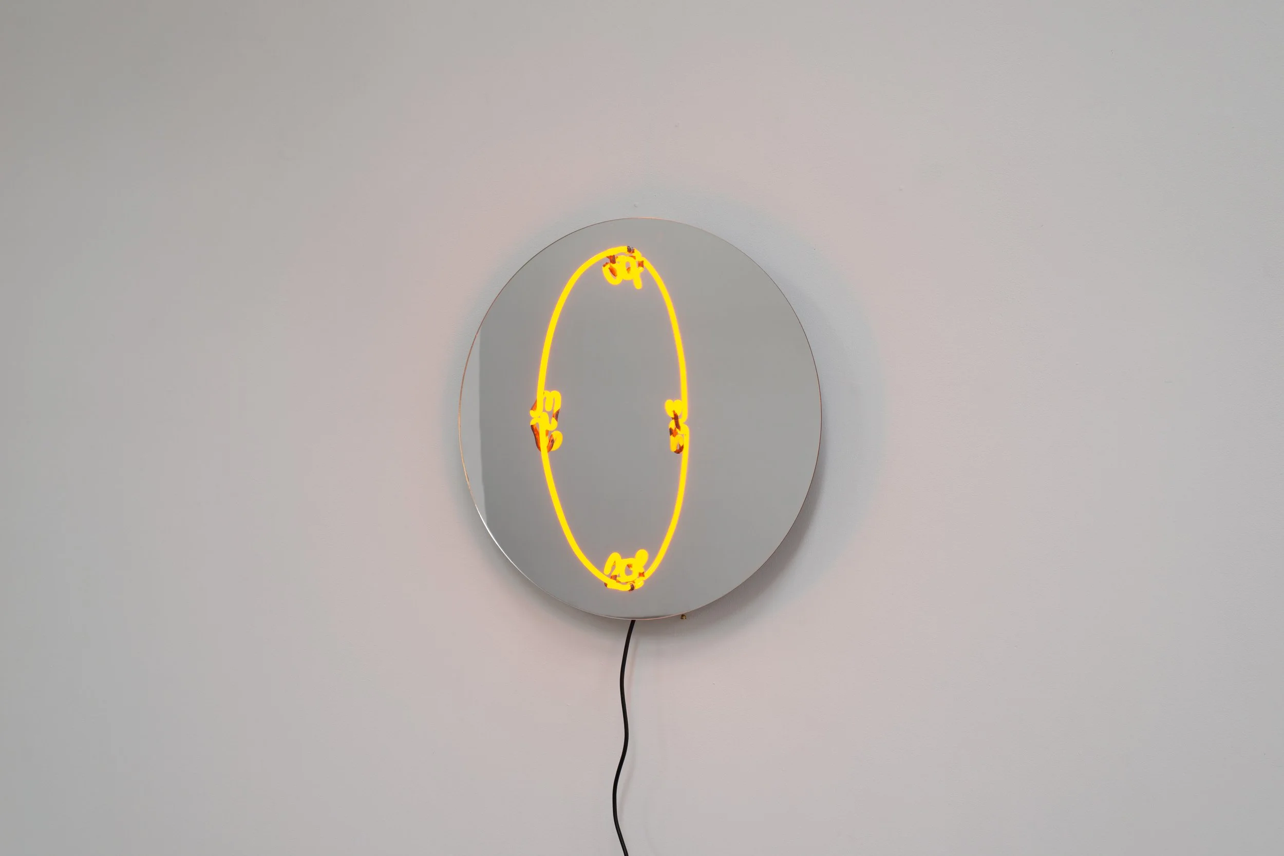 Wall Text: In looking for the river 🌀 the unity of the primordial state & the possibility of freedom in non duality, I found Roxy 🌹 Rose and asked her to bend a “Wheel of Joy” into golden neon.